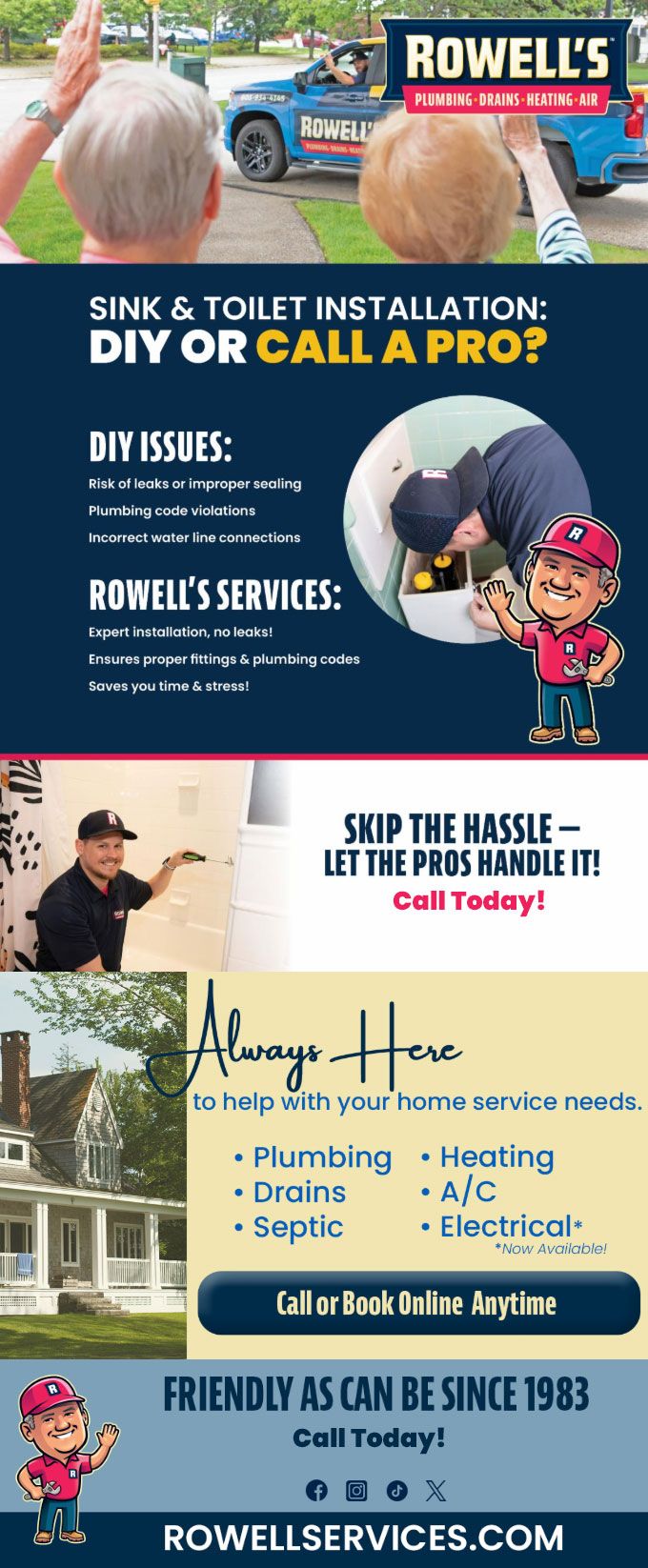 "Friendly As Can Be Since 1983!" When you need help with your plumbing, drains, heating, cooling or electrical in Salisbury, you can always rely on Rowell's Services! Call us now or book online!